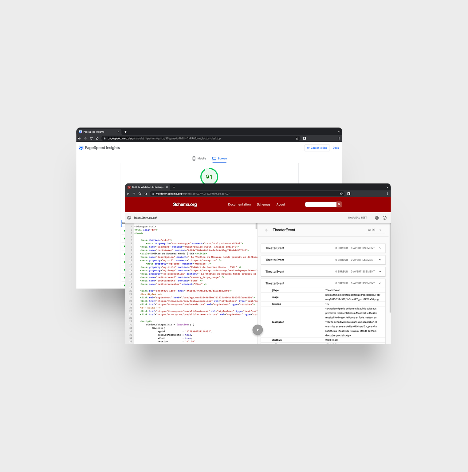 Nous avons fait un gros travail sur les données structurées du site Web afin de garantir au TNM une excellente visibilité. Nous nous assurons constamment des bonnes pratiques de référencement naturel et d'accessibilité en suivant les normes des moteurs de recherche.